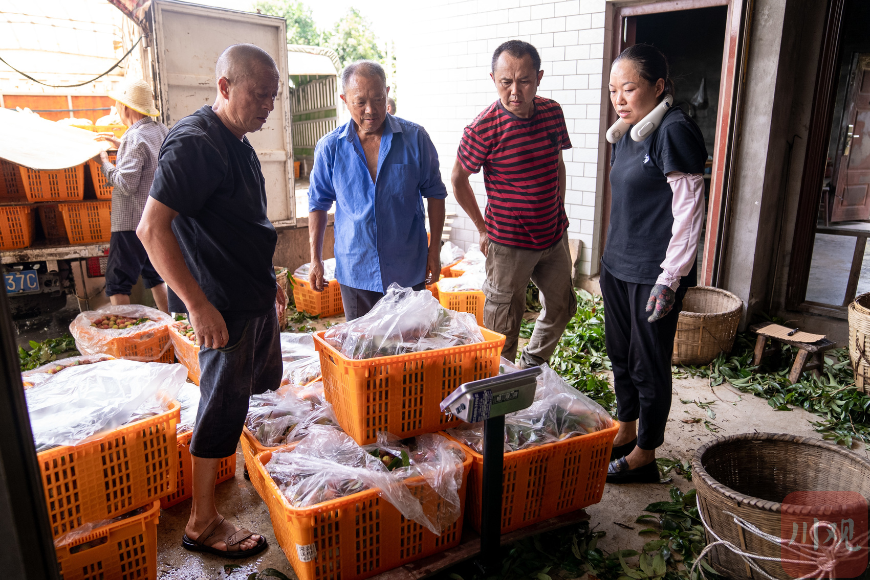 7月17日,泸州市合江县荔江镇五亩村,荔枝种植大户符刚(右二)和村民正在对荔枝进行称重。