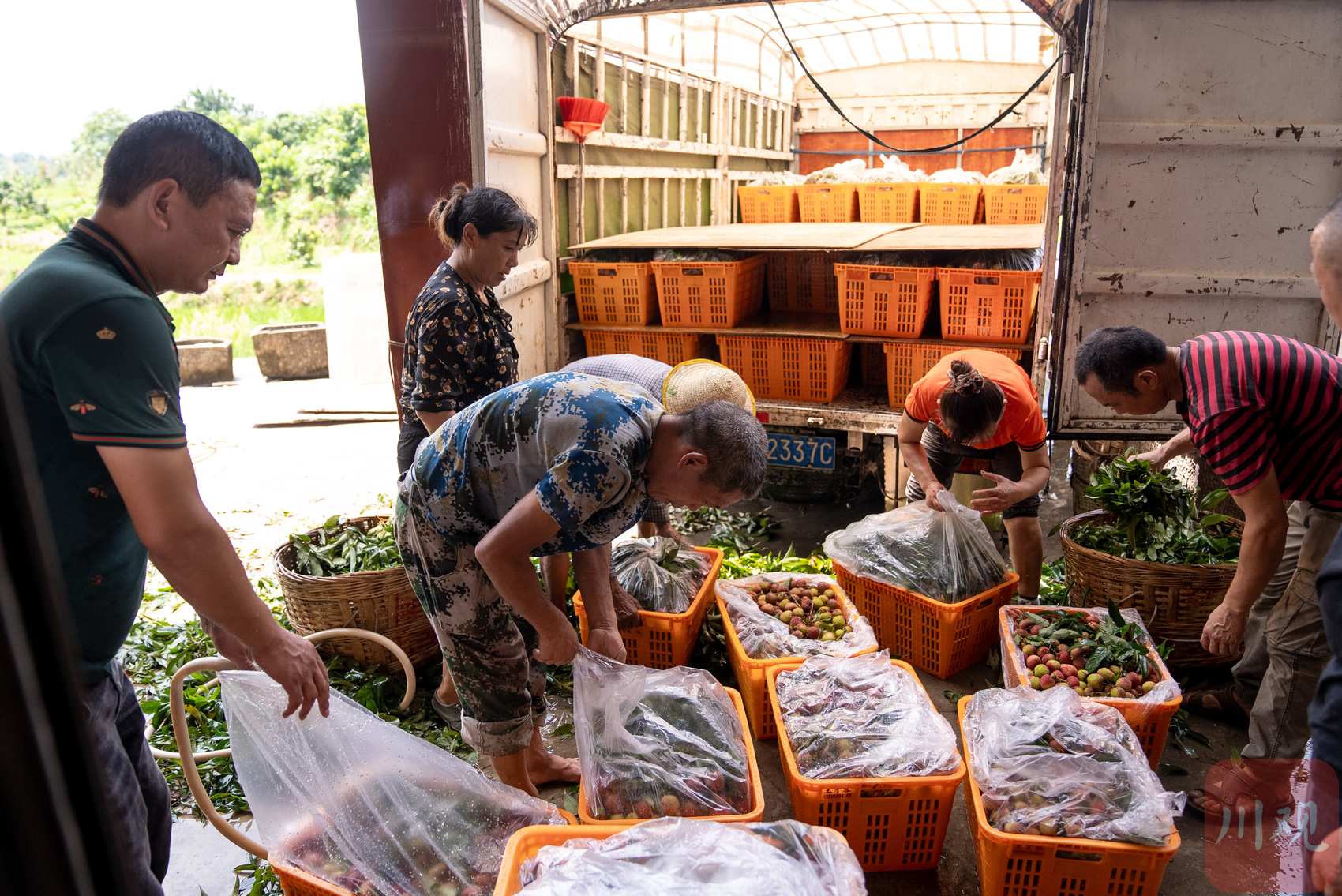 7月17日,泸州市合江县荔江镇五亩村,村民们正在对荔枝进行装车前的降温保湿处理。