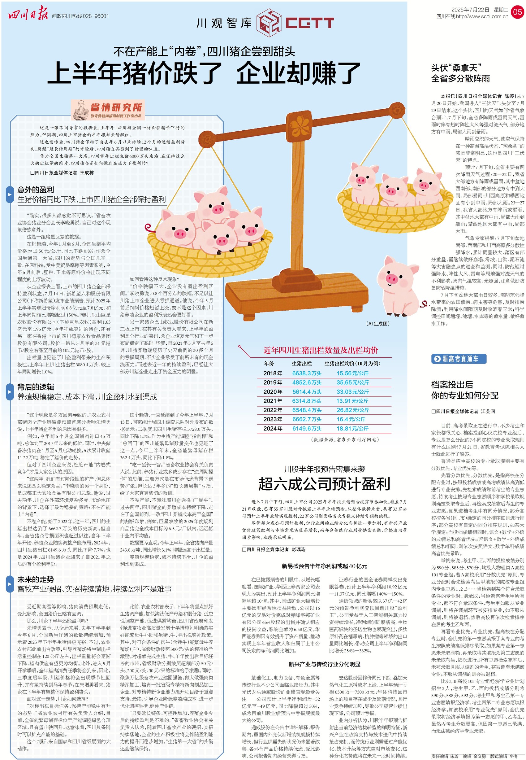 上半年,四川与全国一样面临猪价下行的压力。但同期,四川上市猪企的半年报却业绩飘红。这也意味着,四川猪企保持了自去年6月以来持续12个月的连续盈利势头。作为全国生猪第一大省,四川常年出栏生猪6000万头左右。在保持这么大的出栏量的同时,四川猪企是如何做到在压力下盈利的?关注今日五版,探寻四川猪企盈利背后的逻辑与选择。