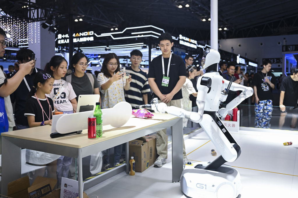 7月29日,参观者在观赏一款可用于零售、工业等多种场景的机器人。