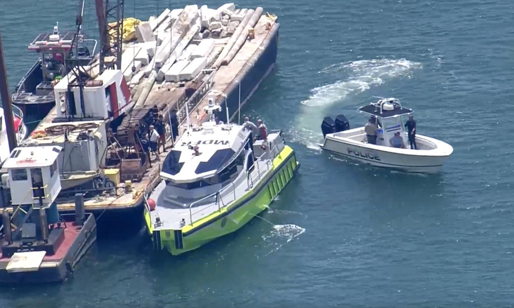 这张7月28日的视频截图显示的是,在美国佛罗里达州迈阿密滩市,救援船只在撞船事故现场工作。
