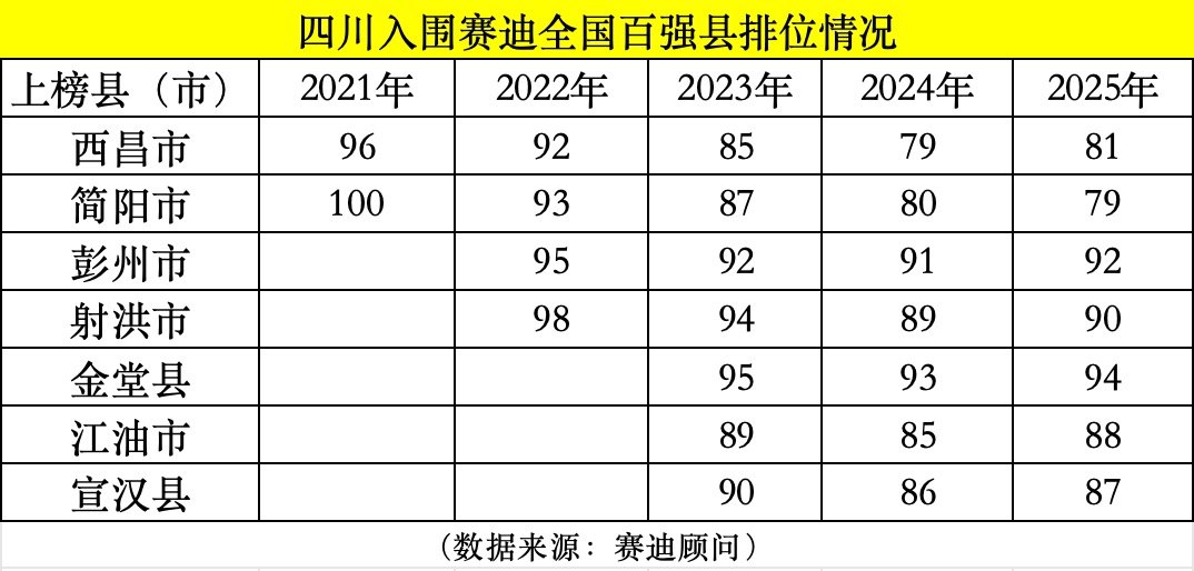 8月5日,赛迪顾问发布“2025赛迪百强区”榜单,四川共有13个区入选;此前发布的2025年全国百强县名单中,四川亦有7地入围。