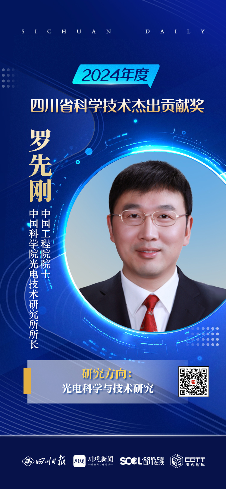 罗先刚,1970年生,中国工程院院士。现任中国科学院光电技术研究所所长,先后任多项国家重大任务首席科学家。长期从事光电科学与技术研究,是亚波长电磁学领域的开创者之一。发现了异常杨氏双缝干涉现象,揭示了广义几何相位效应,建立了广义折反射定律和广义菲涅尔理论,突破了传统光电器件和材料体积重量大、设计自由度低、像差校正困难等难题。研制出了大视场、高分辨成像器件和系统,以及系列薄型天线和吸波材料。以第一完成人获国家技术发明奖一等奖、二等奖,国家自然科学奖二等奖、军队科技进步一等奖、中科院杰出成就奖、四川省科技进步特等奖。个人荣获全国创新争先奖、何梁何利科学与技术进步奖、光华工程科技青年奖、周光召杰出青年基础科学奖等。