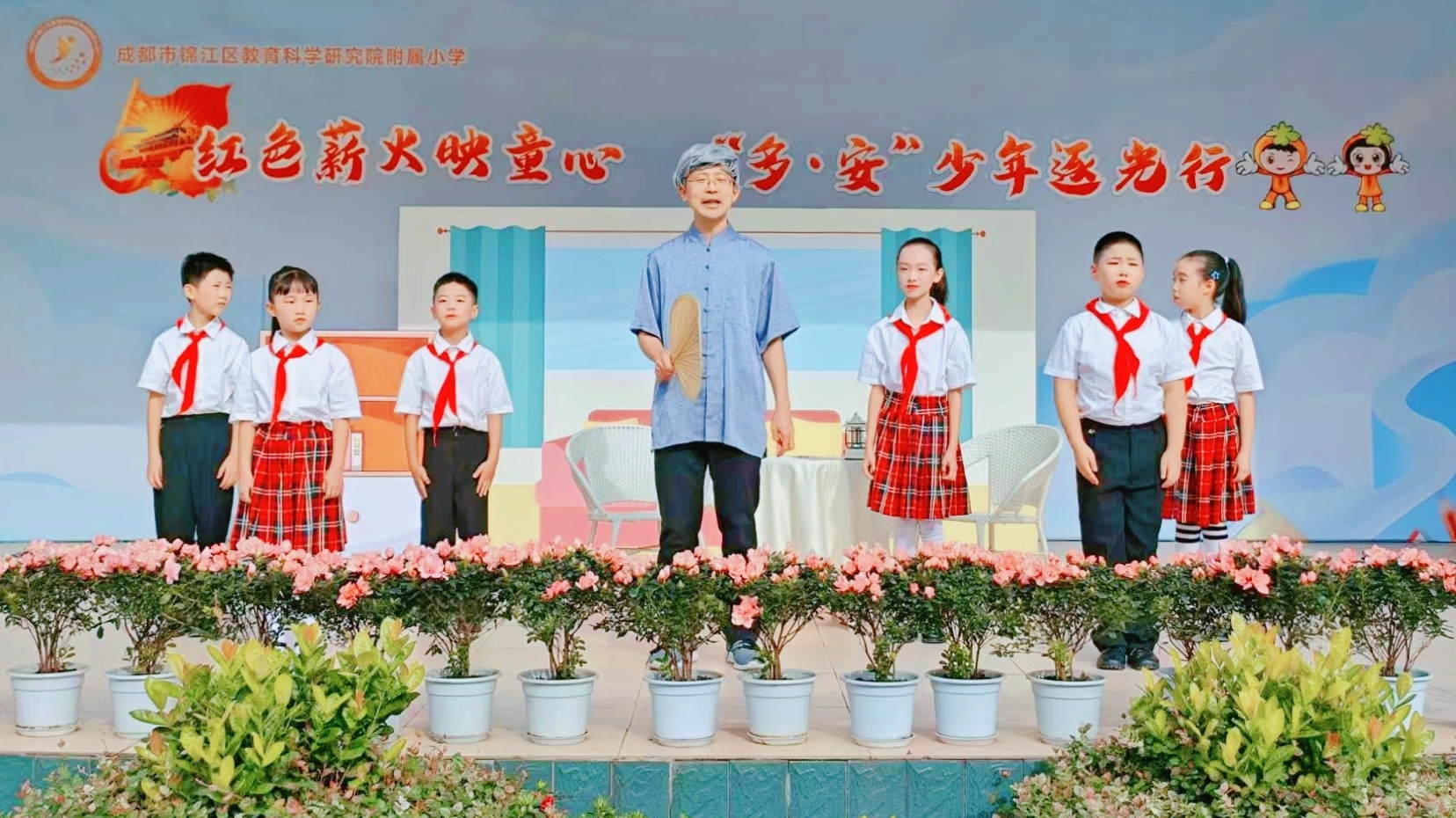 成都市锦江区教育科学研究院附属小学的同学们在成都市京剧研究院老师的带领下,表演节目《一盏红灯映山河》