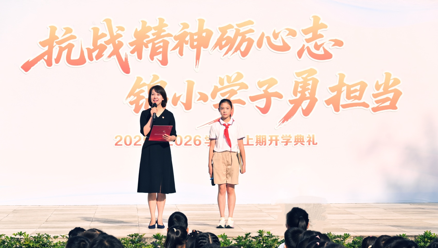 “你们要铭记抗日英雄和抗战精神,抗日英雄的故事不仅出现在咱们的课本里,也在咱们的身边……”早上9点左右,在陈毅元帅的母校、成都市七中育才附属小学锦官驿分校的开学典礼上,学校党总支书记程科通过分享抗战历史以及陈毅元帅的抗战故事,激励同学们在新学期传承英雄之志,一起铭记历史、奋发图强,争做爱党爱国、勤奋好学、全面发展的新时代好少年。