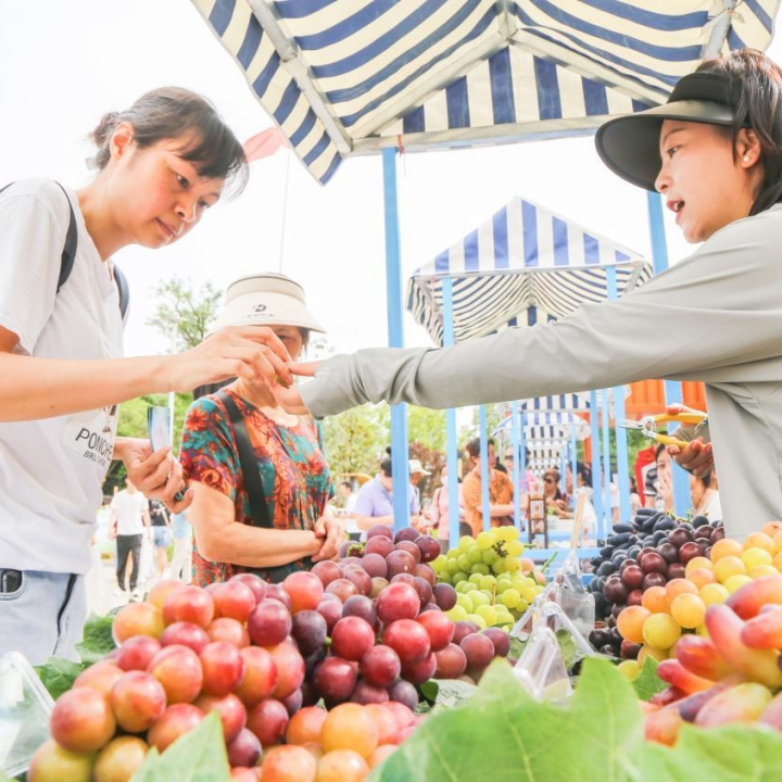 这里有本地农户伯伯阿姨们刚摘下的新鲜葡萄、猕猴桃以及各种特色小吃。买点新鲜的农产品带回家,也可以直接在现场的美食品鉴区坐下来,通过扫码在碧湖春非遗工坊、半山居农家乐点一份烤兔套餐,边吃边等晚上的大戏开场!这氛围,简直绝了!