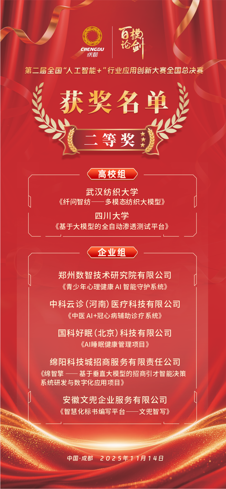 11月13日,“百模论剑·第二届全国‘人工智能+’行业应用创新大赛”全国总决赛在成都完赛。绵阳科技城招商服务有限责任公司自主研建的“绵智擎—基于垂直大模型的招商引才智能决策系统研发与数字化应用项目”(简称“绵智擎”项目)与55支来自全国的顶尖队伍同台竞技,最终荣获全国二等奖。