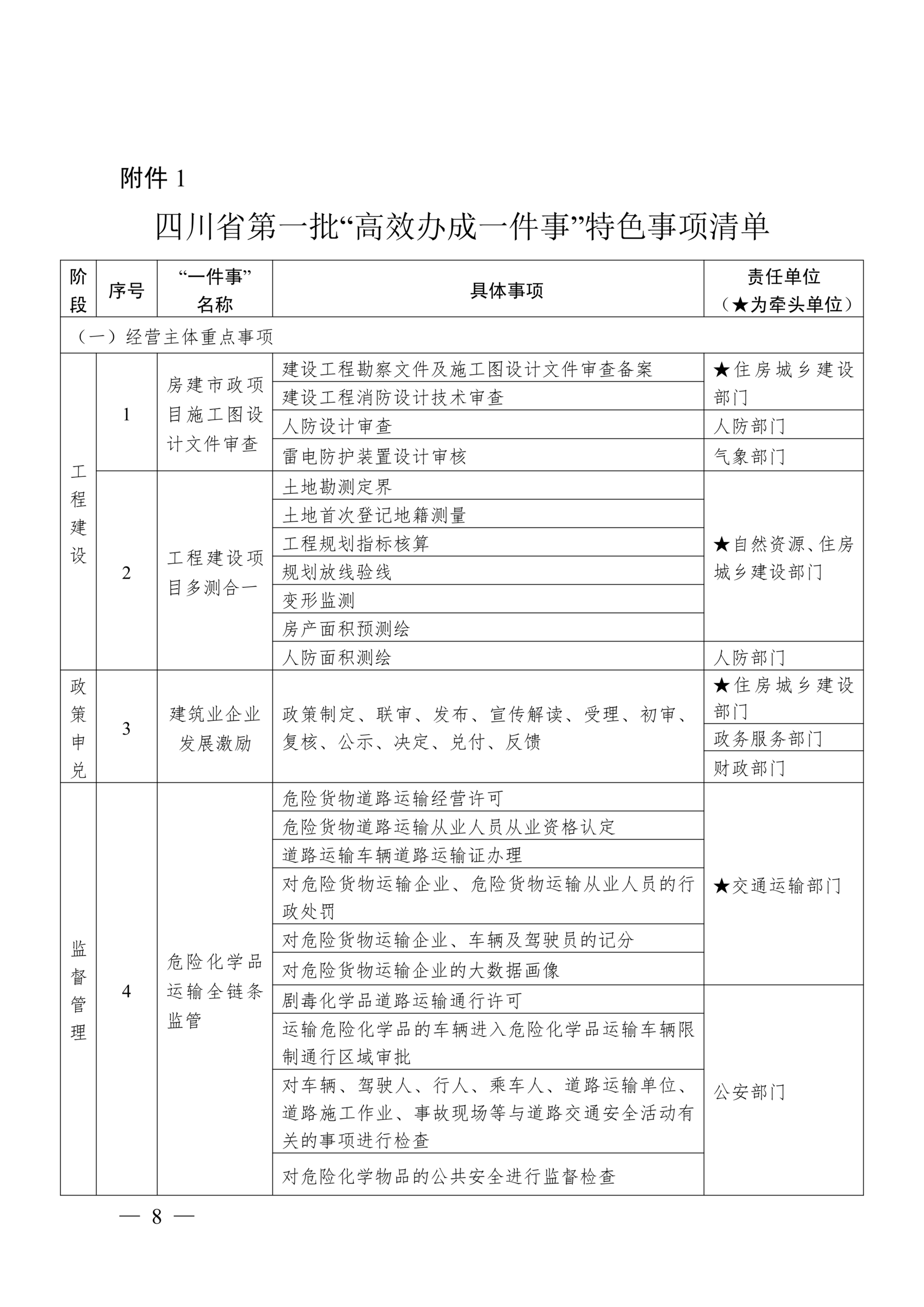 在加强重点事项清单管理方面,《实施意见》强调在完成国家明确的重点事项基础上,聚焦企业群众办事实际需求,推动更多反映强烈的办事堵点通过“一件事”高效办理;运用“高效办成一件事”理念,从利企便民、监管全链条、政策申兑、机关运行等维度,形成四川省特色“一件事”清单并推进实施;探索“高效办成一类事”,即,从个人群体类型、企业成长阶段、产业发展链条等维度,集成为“一类事”,提供更加集约、广泛、便捷的套餐式服务。