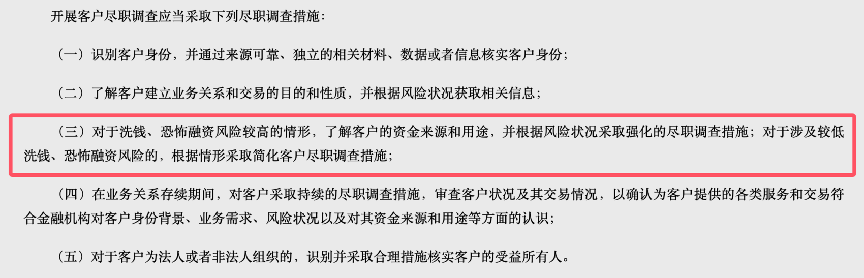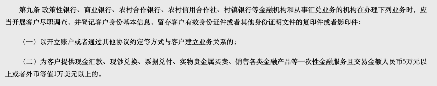 此次新的《管理办法》规定,政策性银行、商业银行、农村合作银行、农村信用合作社、村镇银行等金融机构和从事汇兑业务的机构在为客户提供现金汇款、现钞兑换、票据兑付、实物贵金属买卖、销售各类金融产品等一次性金融服务且交易金额人民币5万元以上或者外币等值1万美元以上的业务时,应当开展客户尽职调查,并登记客户身份基本信息,留存客户有效身份证件或者其他身份证明文件的复印件或者影印件。