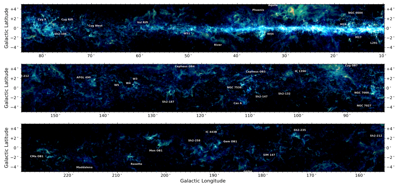 △“银河画卷”数据合成的红、绿、蓝三色图。图中标识了著名的恒星形成区或气体结构,不同密度环境下的大尺度气体结构和形态各异的分子云细节清晰可见。