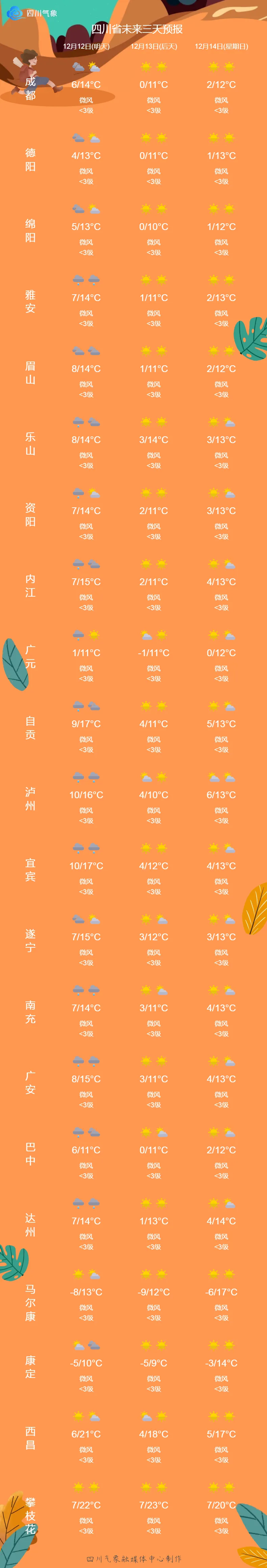 今天(12月11日)16时,四川省气象台发布强降温蓝色预警:预计12日至14日,盆地有一次强降温天气过程,日平均气温将累计下降5~7℃,其中12日大部地方有小雨,东北部有中雨,盆周高海拔山区有雨夹雪或小雪,并伴有5~7级偏北风,北部局部可达8级或以上;13—14日大部晴间多云,早上有霜冻,最低气温北部西部将下降至-2~2℃,其余地方2~4℃。此外,12日川西高原东部和凉山州东北部有阵雪(雨),局地有中雪。