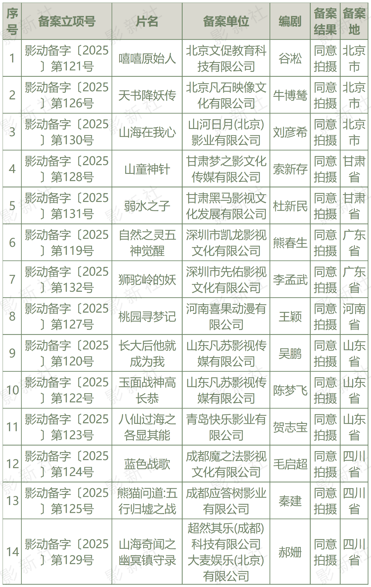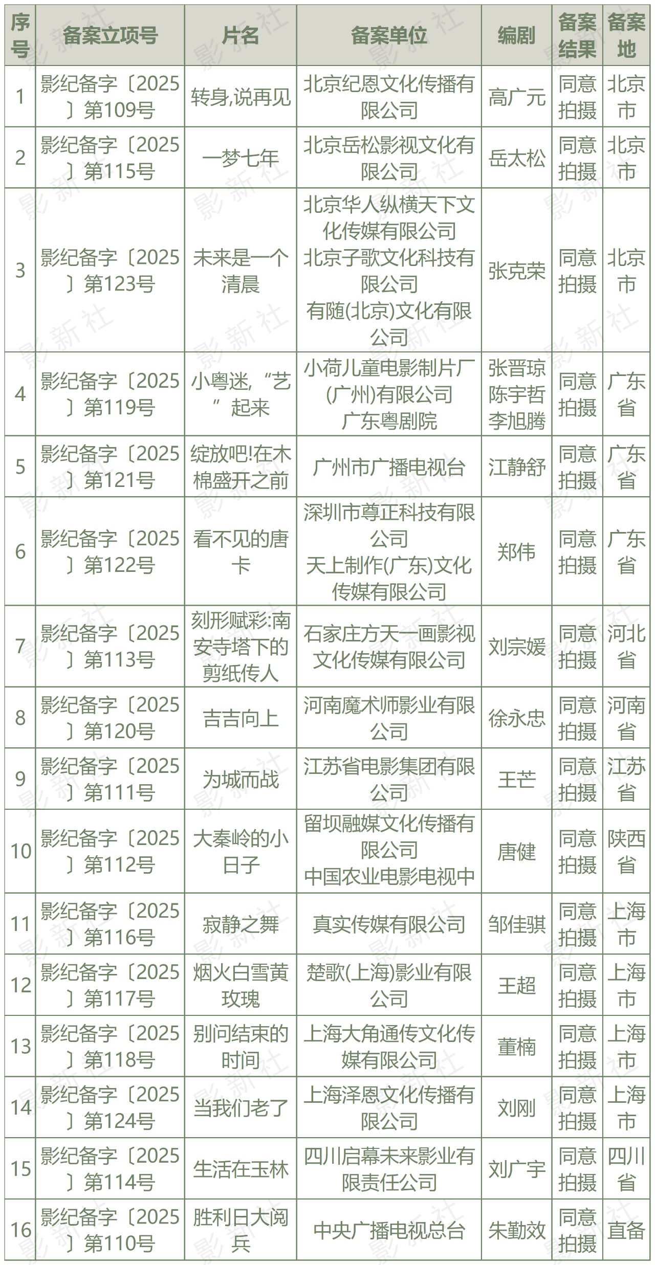 根据公示信息,此次获备案的十部影片分别为:《歌照唱,舞照跳》《我心灿烂》《望平乡的夏天》《川剧芳华》《三朵云飘来》《贡嘎山》《蓝色战歌》《熊猫问道:五行归墟之战》《山海奇闻之幽冥镇守录》《生活在玉林》,类型涵盖故事片、动画片和纪录片。