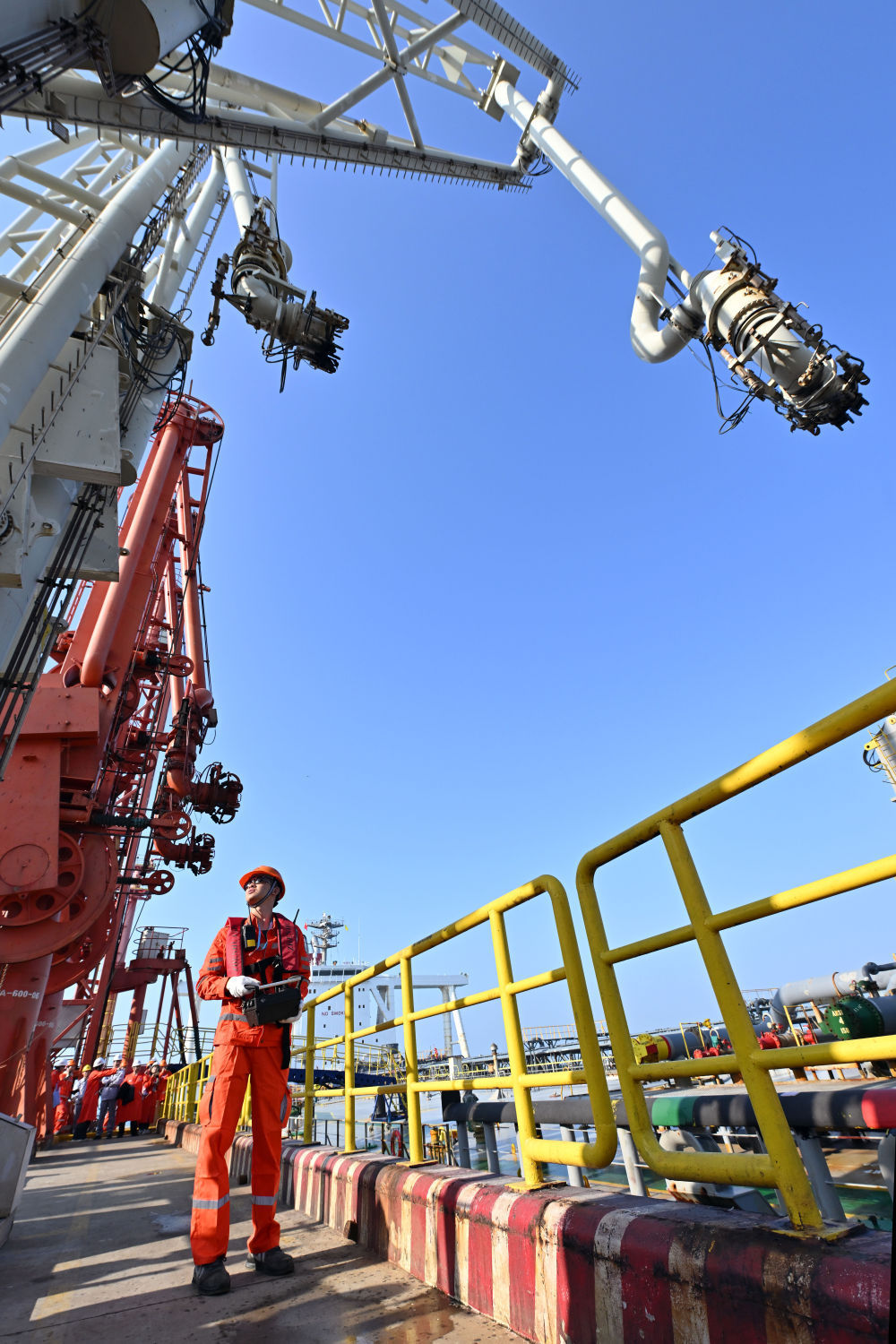↑ 12月18日,装载着石化原辅料的船舶抵达洋浦港后,国投洋浦油储码头工作人员进行卸油作业。