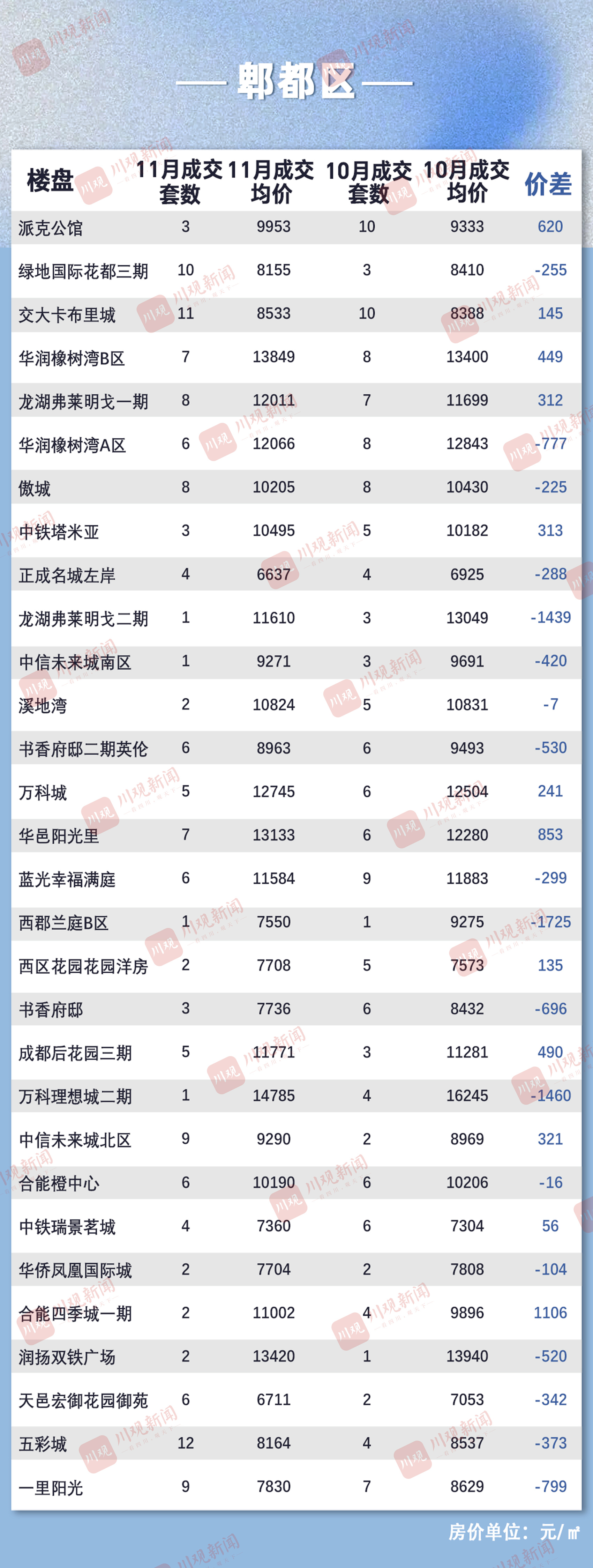 特别提示:本月收录数据,仅为成交房屋的“一房一价”,而并非“均价”或代表整体形势,仅供参考。本表格采样自贝壳、安居客、房天下等公开平台,绝大多数情况下反映的是二手房的成交情况,其内容仅供参考。最终解释权归川观新闻所有。