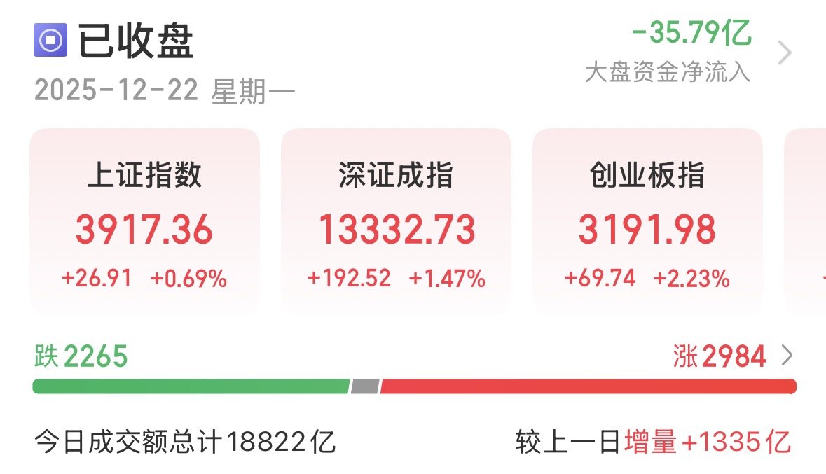 12月22日,A股三大指数集体走强,沪指自12月10日后重新站稳3900点整数关口。截至收盘,沪指涨0.69%,收报3917.36点;深证成指涨1.47%,收报13332.73点;创业板指涨2.23%,收报3191.98点。