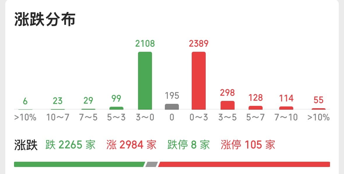 全市场全天成交额达到18822亿元,较上一交易日放量1335亿元。从个股涨跌情况来看,超2900只个股上涨,其中涨停股105只;共2265只个股下跌,市场喜忧参半。