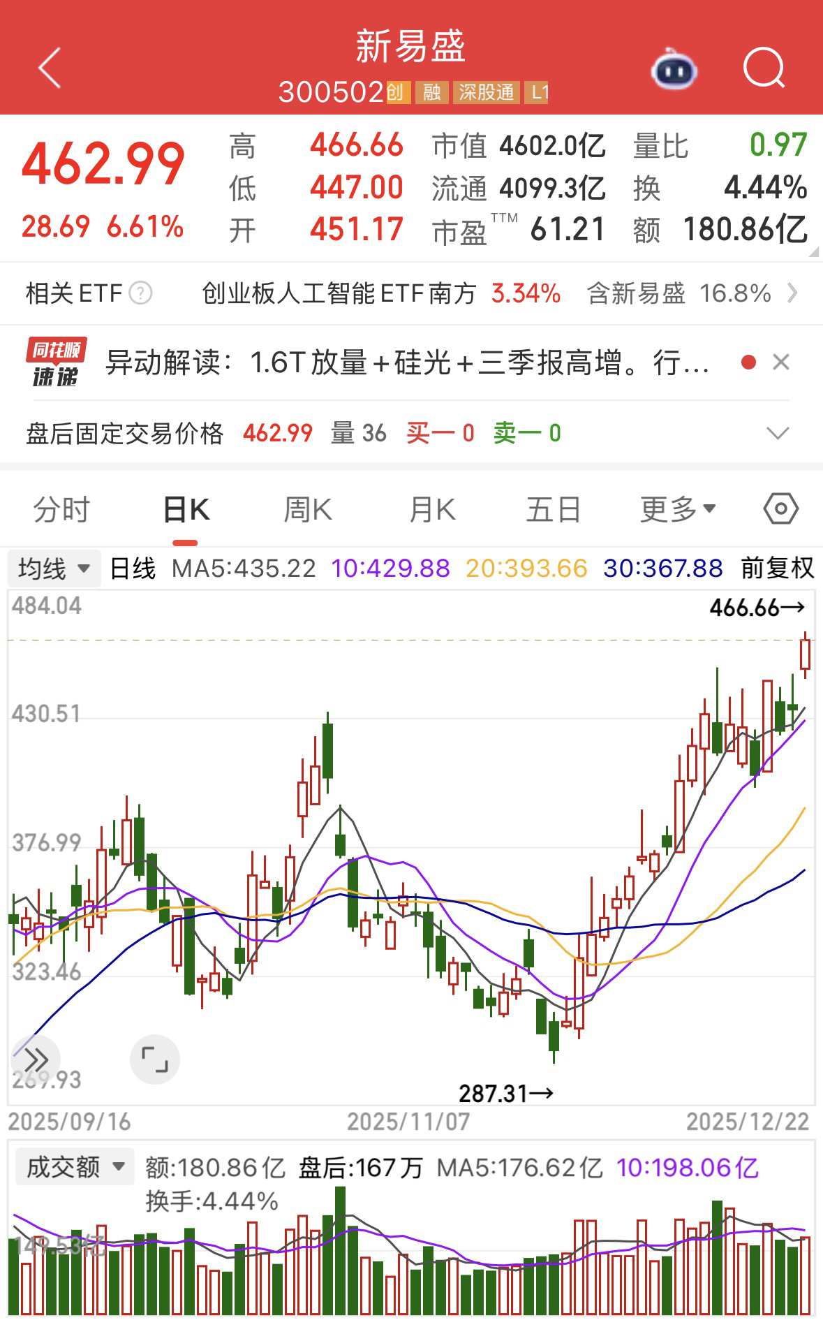 尤其川股新易盛,早盘一度大涨超7%,刷出466.66元/股的历史新高价,这和4月9日盘中触及的46.56元低点相比,年内已完成股价暴涨十倍的“壮举”。