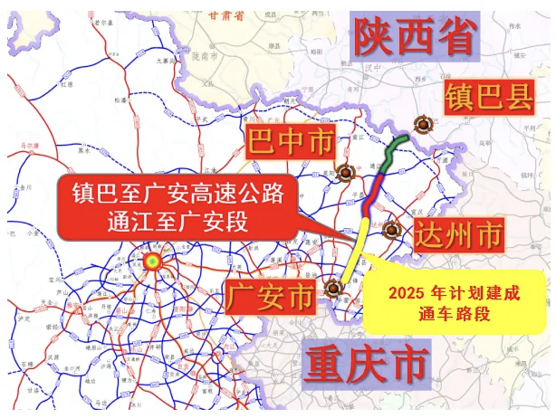 镇广高速北起陕西镇巴(川陕界),南至四川广安,线路总长约251公里,是《四川省高速公路网布局规划(2022—2035年)》中13条纵线之一,由川陕界至王坪段、王坪至通江段、通江至广安段组成。其中,王坪至通江段33.4公里已于2022年1月18日通车。