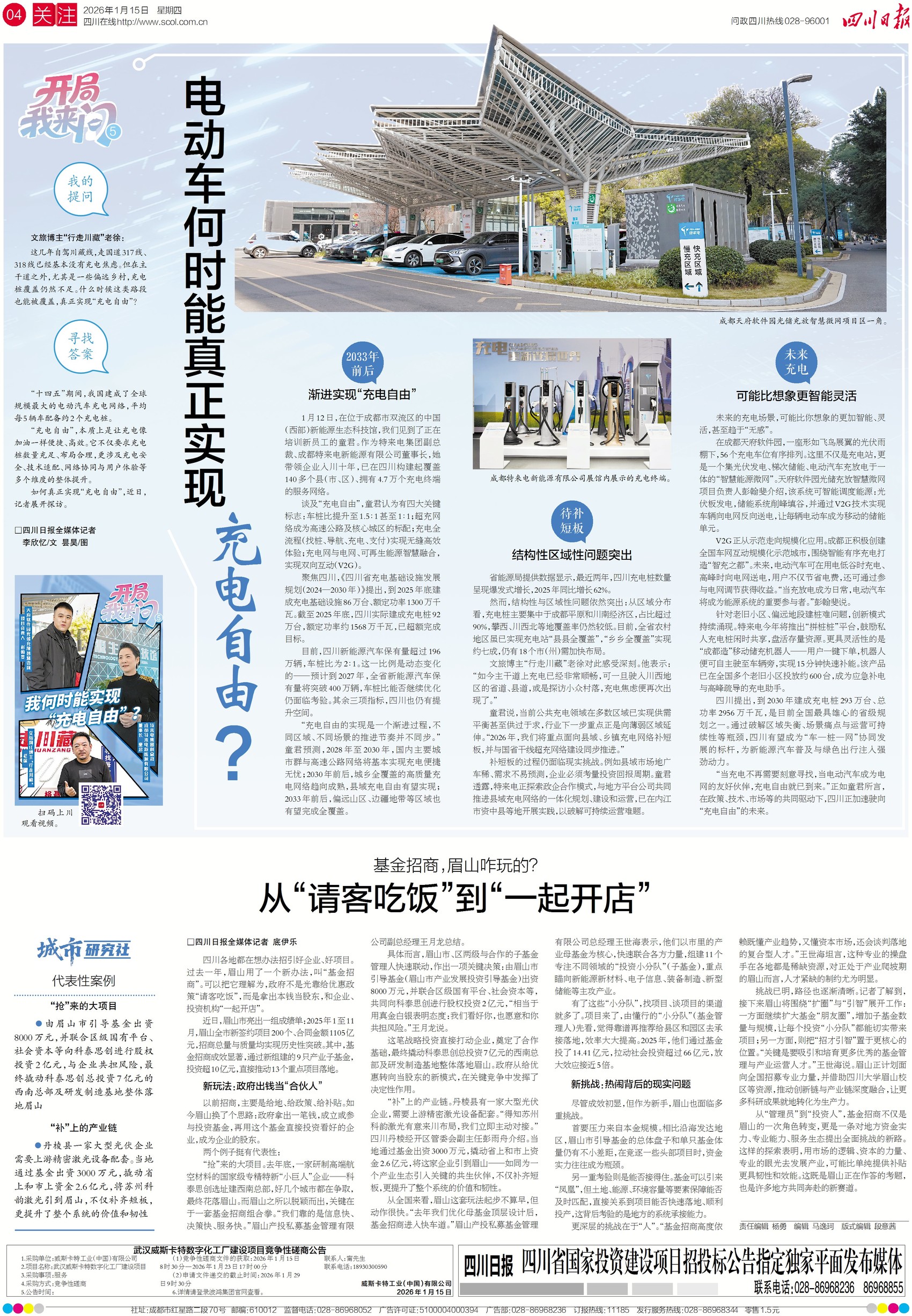 如今自驾川藏线,主干道充电已经很顺畅,但偏远乡村的“充电焦虑”何时能解?截至去年底,四川已建成充电桩92万台,充电站已覆盖所有县城和约七成乡镇;专家预测,2033年前后,偏远山区等也有望实现充电网络全覆盖。未来,充电将更加智能便捷,你的电动汽车甚至可能在用电低谷时充电、高峰时“卖电”赚钱。四川正加速驶向“充电自由”的未来,详情关注今日四版。