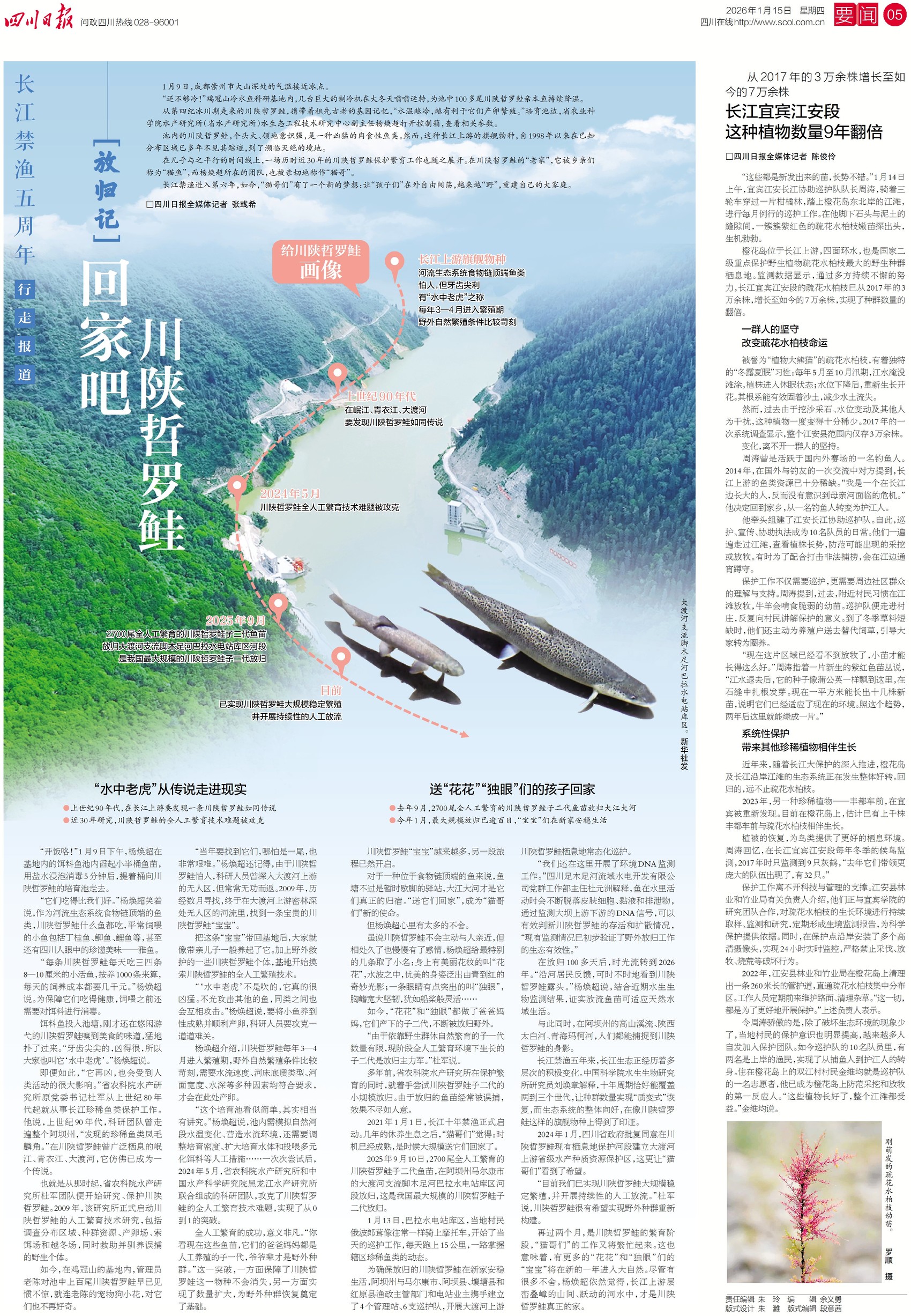 长江里一度濒临消失的“水中老虎”——川陕哲罗鲑,正被一群“猫哥”努力带回我们的视野。经过近30年努力,川陕哲罗鲑的全人工繁育技术难题被攻克,为它们重返自然铺平了道路。去年9月,2700尾人工繁育的子二代鱼苗被放归,如今,它们在野外独立生活已超百日,沿河居民还能不时看到它们的身影。长江禁渔五年,“水中老虎”野外种群重建迈出了关键一步。详情关注今日五版。