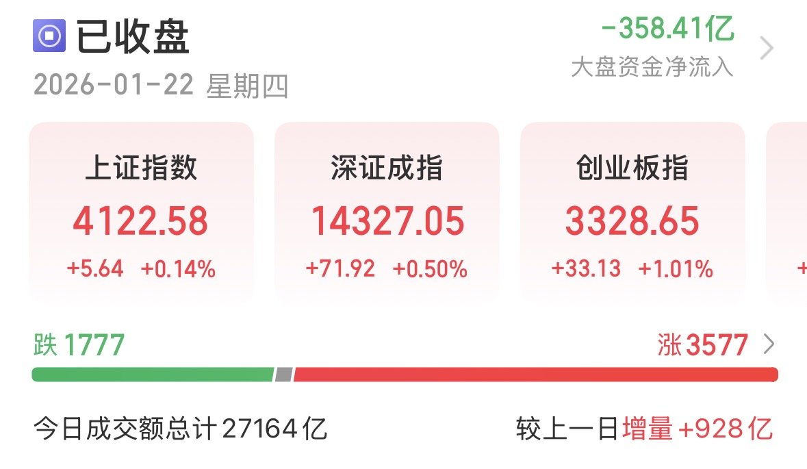 1月22日,A股三大指数集体收涨,沪指涨0.14%,收报4122.58点;深证成指涨0.50%,收报14327.05点;创业板指涨1.01%,收报3328.65点。沪深京三市成交额达到27166亿,较昨日放量926亿,连续第14个交易日突破2.5万亿。个股方面,全市场共3577只股票上涨,逾90只股票涨停,赚钱效应显著。