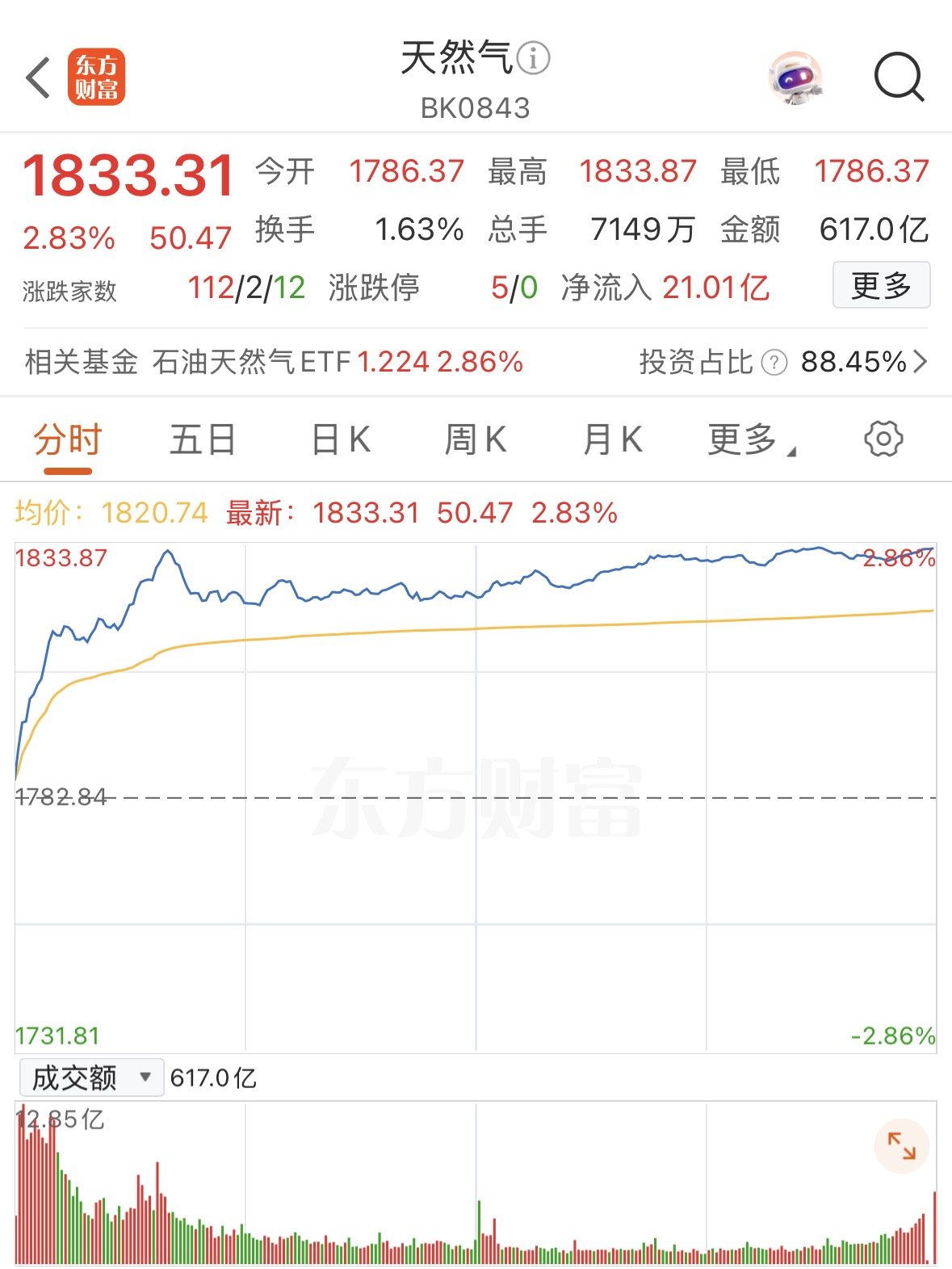 市场上同样升温的还有天然气板块。盘中板块触及1833.87点,刷新历史纪录。个股方面,特瑞斯“30cm”涨停,中泰股份涨超过15%。这波上涨行情,主要是受到天气影响,市场对取暖需求的预期持续升温。