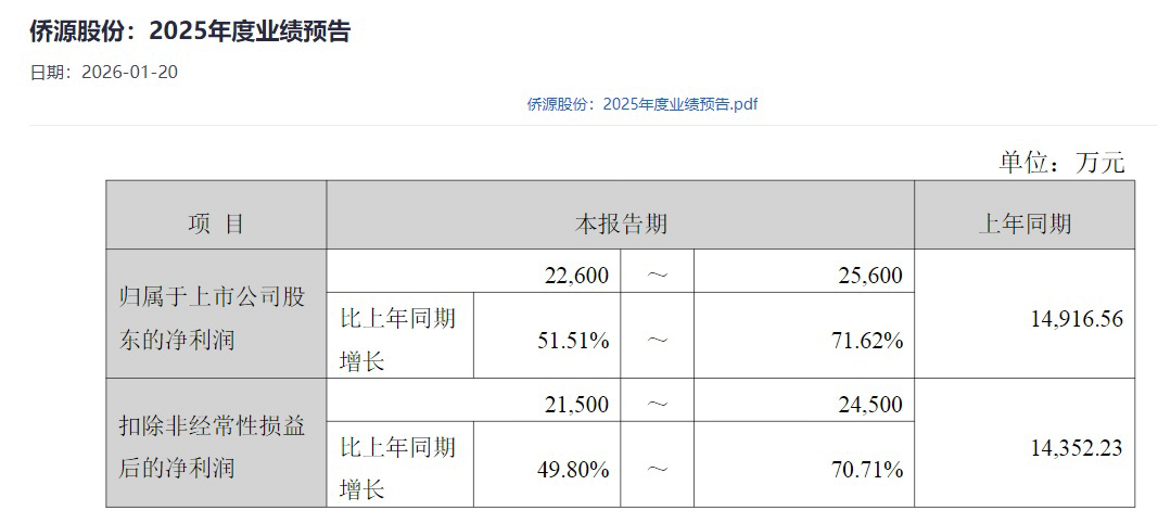 四川板块方面,侨源股份今日一路冲高,最终实现“20cm”涨停,股价收报65.12元/股,创下历史新高,周线来看,该股已经连涨三周。今日上涨,主要是受业绩预告影响。在2025年度业绩预告中,侨源股份预计年度实现归属于上市公司股东的净利润为2.26亿元至2.56亿元,同比增长51.51%至71.62%。实实在在的盈利,成为众多投资者青睐该股的原因。