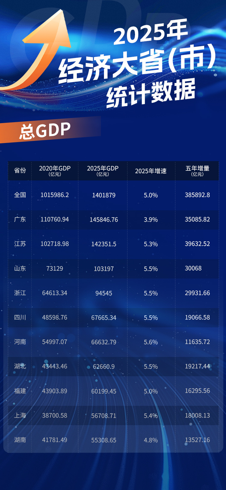2025年中国经济总量首次跃上140万亿元新台阶。在这幅宏大的经济图景中,广东、江苏、山东、浙江、四川、河南、湖北、福建、上海、湖南等全国十大经济省市,扮演着无可替代的引领角色。