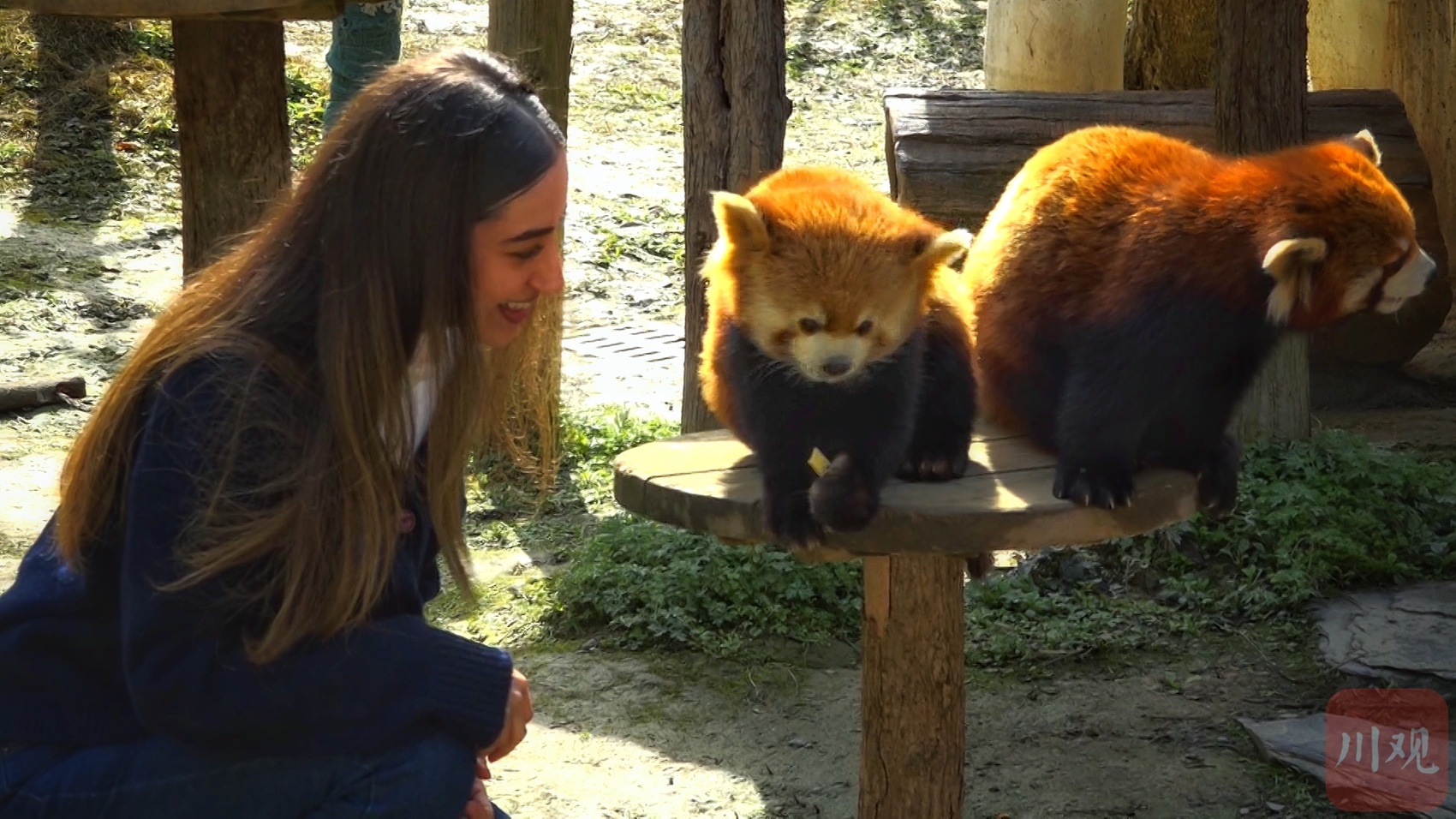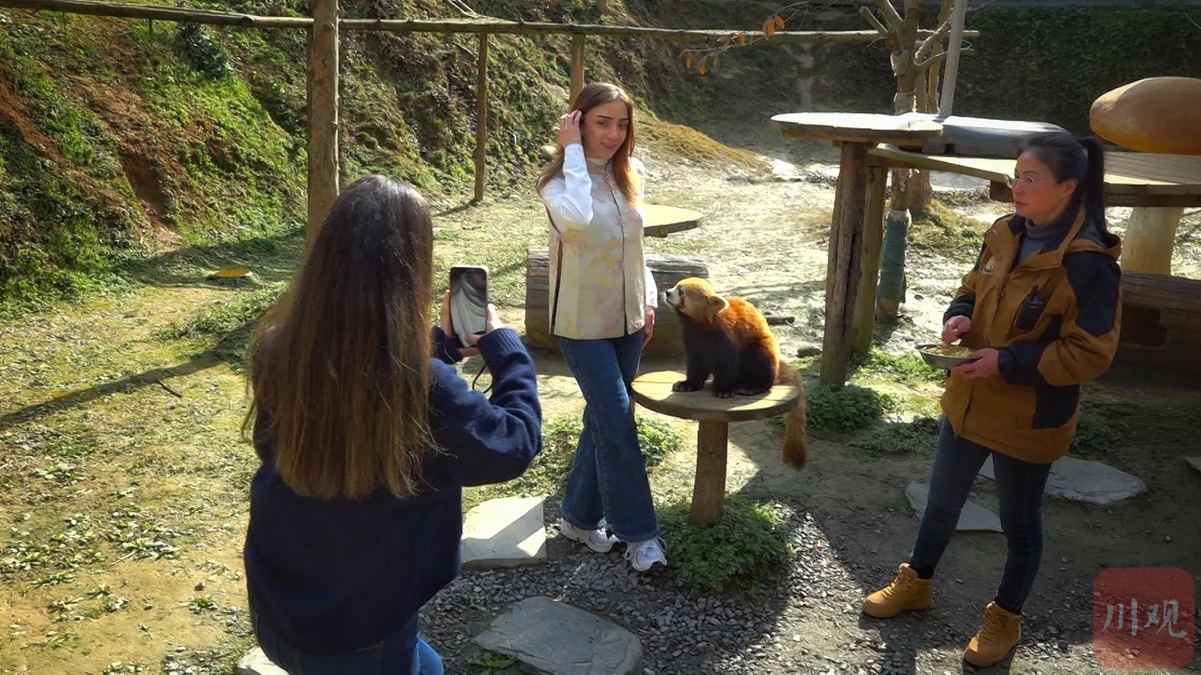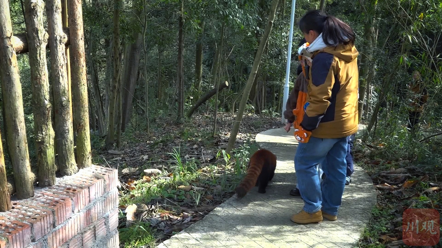 小熊猫穿梭林间与游客互动。