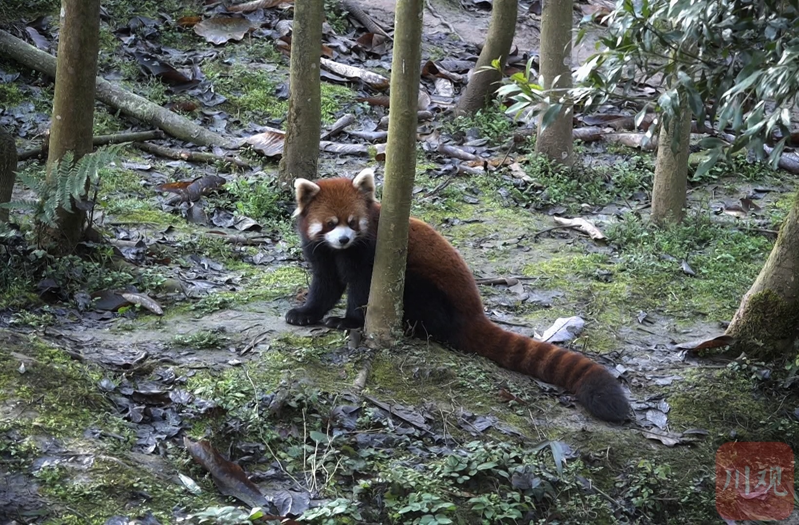 小熊猫穿梭在林间。