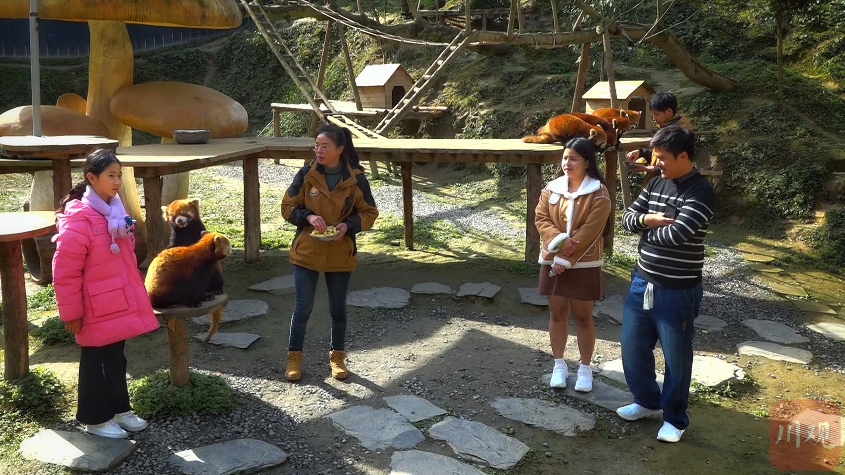 都江堰小熊猫森林公园春节人气火爆,浣熊与小熊猫软萌互动,吸引众多市民游客前来体验乡村自然野趣。