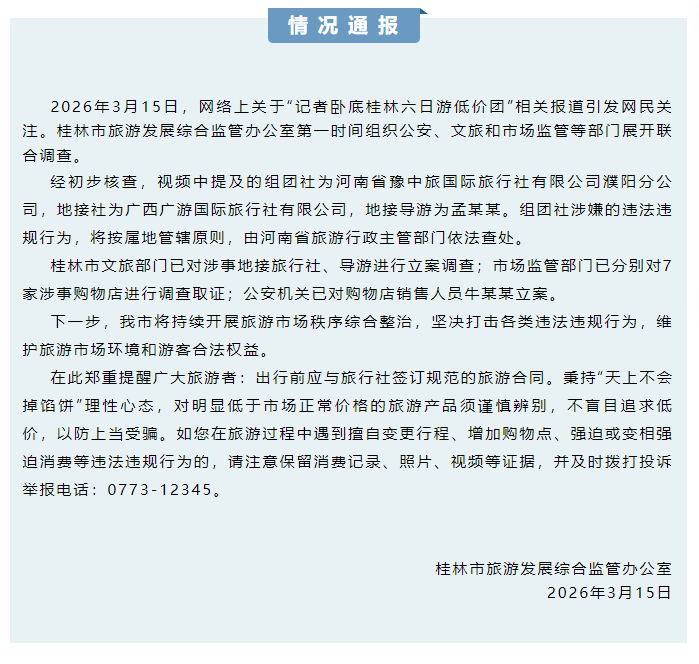 2026年3月15日,网络上关于“记者卧底桂林六日游低价团”相关报道引发网民关注。桂林市旅游发展综合监管办公室第一时间组织公安、文旅和市场监管等部门展开联合调查。