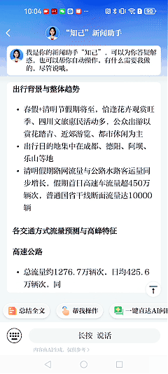 当你面对一篇长篇报道或政策文件,不妨让“知己”帮你总结全文。这位答疑解惑的“知己”会用简洁清晰的语言,为你厘清要点、梳理重点、直击痛点。从此,川观新闻为你提供最新鲜的资讯,而“知己”为你带来更透彻的解读——两者相遇,共同刷新你的深度阅读体验。