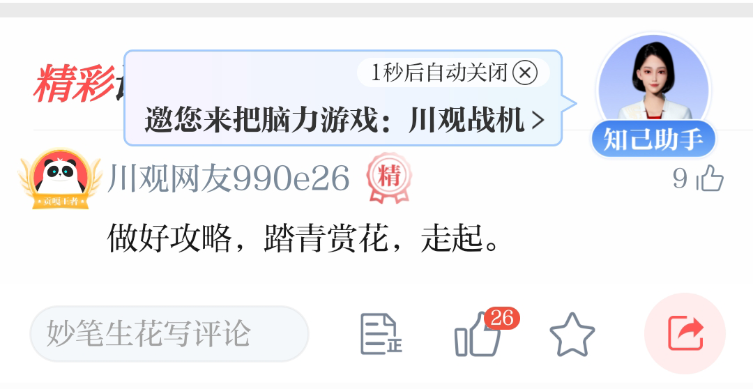 今天打开APP,发现川观给我塞了个“私人秘书”🤵,名字叫“知己”,刚上线。我说:新闻太长不看。它秒回:我帮你总结。我说:想看病。它弹出AI问医,从科普到挂号一条龙。甚至我说:开一局川观超级足球。它真给我开了。⚽️现在流行“爱你老己”!,感谢川观送来贴心知己,懂你甚于自己!