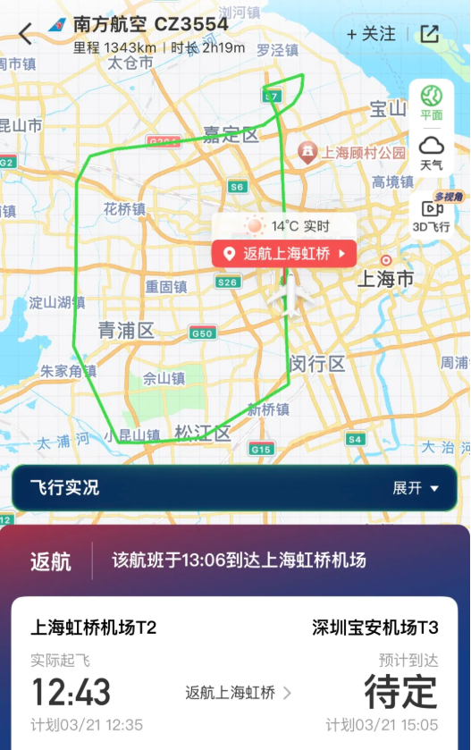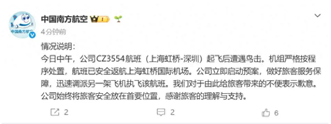 刚刚,中国南方航空发布情况通报:今日中午,公司CZ3554航班(上海虹桥-深圳)起飞后遭遇鸟击。机组严格按程序处置,航班已安全返航上海虹桥国际机场。