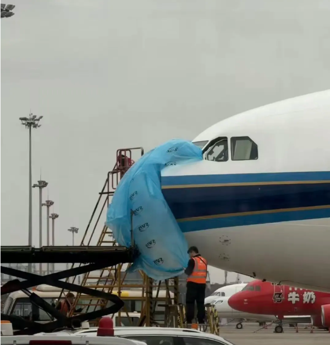 据网友“120°E,28°N”图片,在机坪上,南航机务人员用塑料布,将裸露的雷达天线包裹起来。