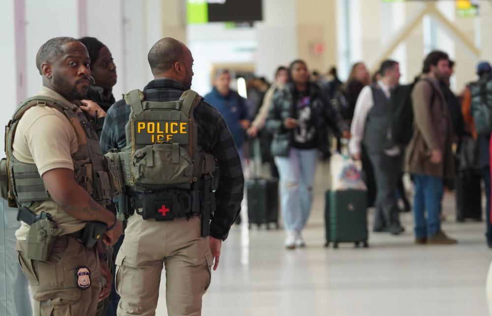 3月23日,移民与海关执法局的执法人员在美国纽约拉瓜迪亚机场的出发安检处执勤。新华社记者 张凤国 摄