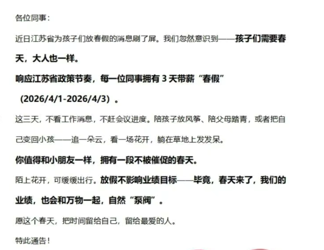 通知中还写道,“要拼搏,也要有停下来的从容。这三天不看工作消息,不赶会议进度,可以陪孩子放风筝、陪父母踏青,或者把自己变回小孩——追一朵云,看一场花开,躺在草地上发发呆。”