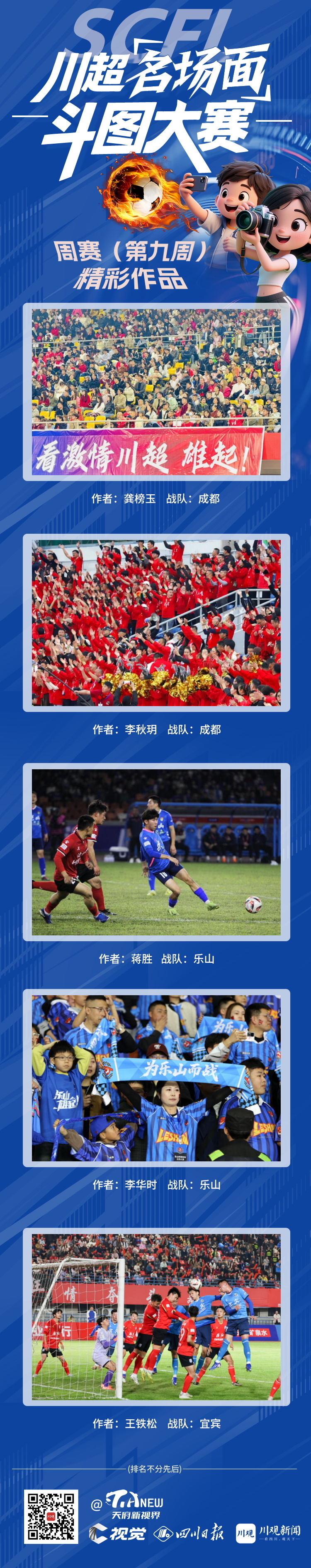 第九周征集恰逢川超决赛激战正酣,赛场之上,球员的凌空爆射、默契配合、绝杀瞬间扣人心弦;赛场之外,球迷的齐声呐喊、城市的温情应援、看台上的热血瞬间皆是风景。