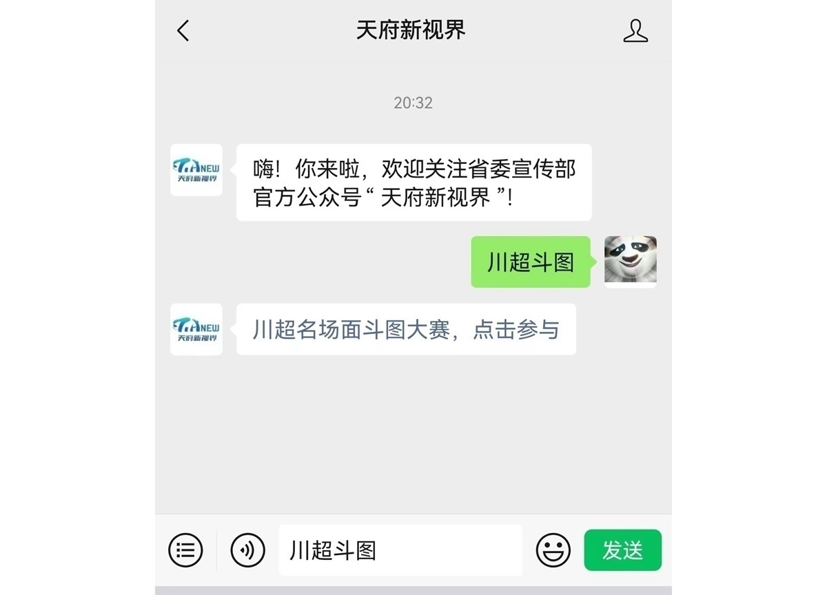 入口三:关注“天府新视界”微信公众号,在对话框私信回复“川超斗图”,即可获取活动链接点击参与。