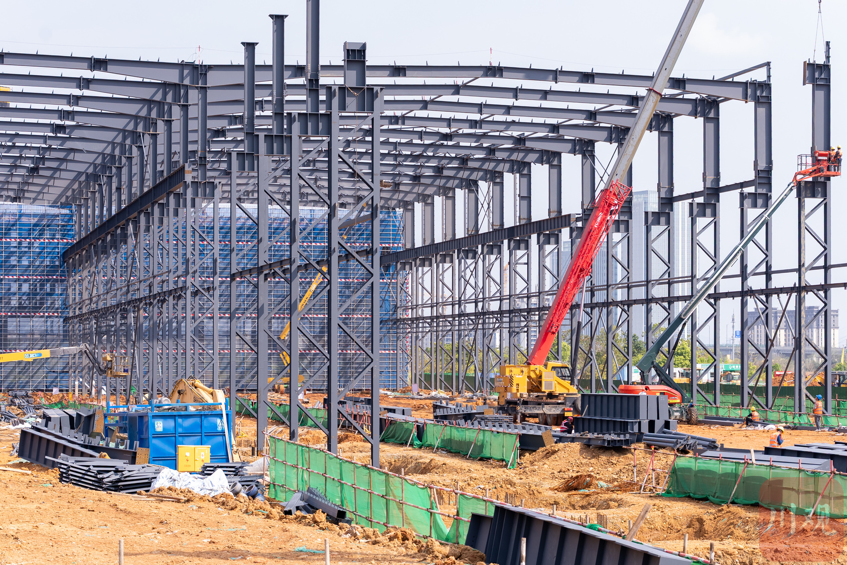 超过3个标准足球场大小的场地上,两辆吊车“左右开弓”,总装厂房钢结构的“骨架”从无到有,从少至多。