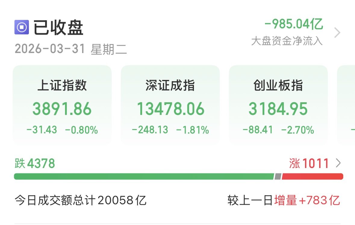 3月31日,A股三大指数集体回调。截至收盘,沪指跌0.80%,收报3891.86点;深证成指跌1.81%,收报13478.06点;创业板指跌2.70%,收报3184.95点。全市场成交额20058亿,较昨日放量783亿。个股亏钱效应显著,全市场超过4300只个股下跌,仅1011只个股上涨。