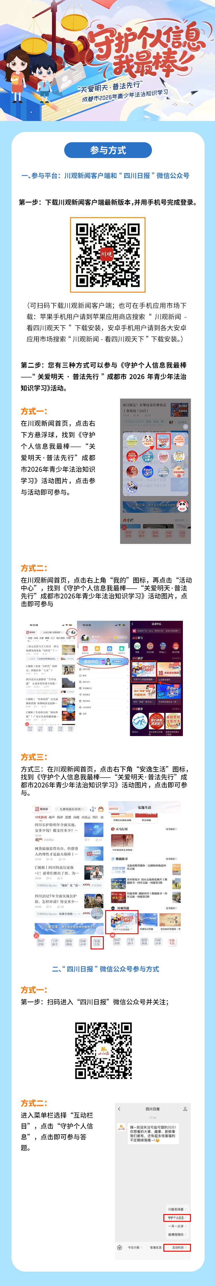 今日(3月31日),由成都市关心下一代工作委员会主办,川观新闻承办的“守护个人信息我最棒——‘关爱明天·普法先行’成都市2026年青少年法治知识学习”活动在川观新闻客户端和“四川日报”官方微信同步上线。