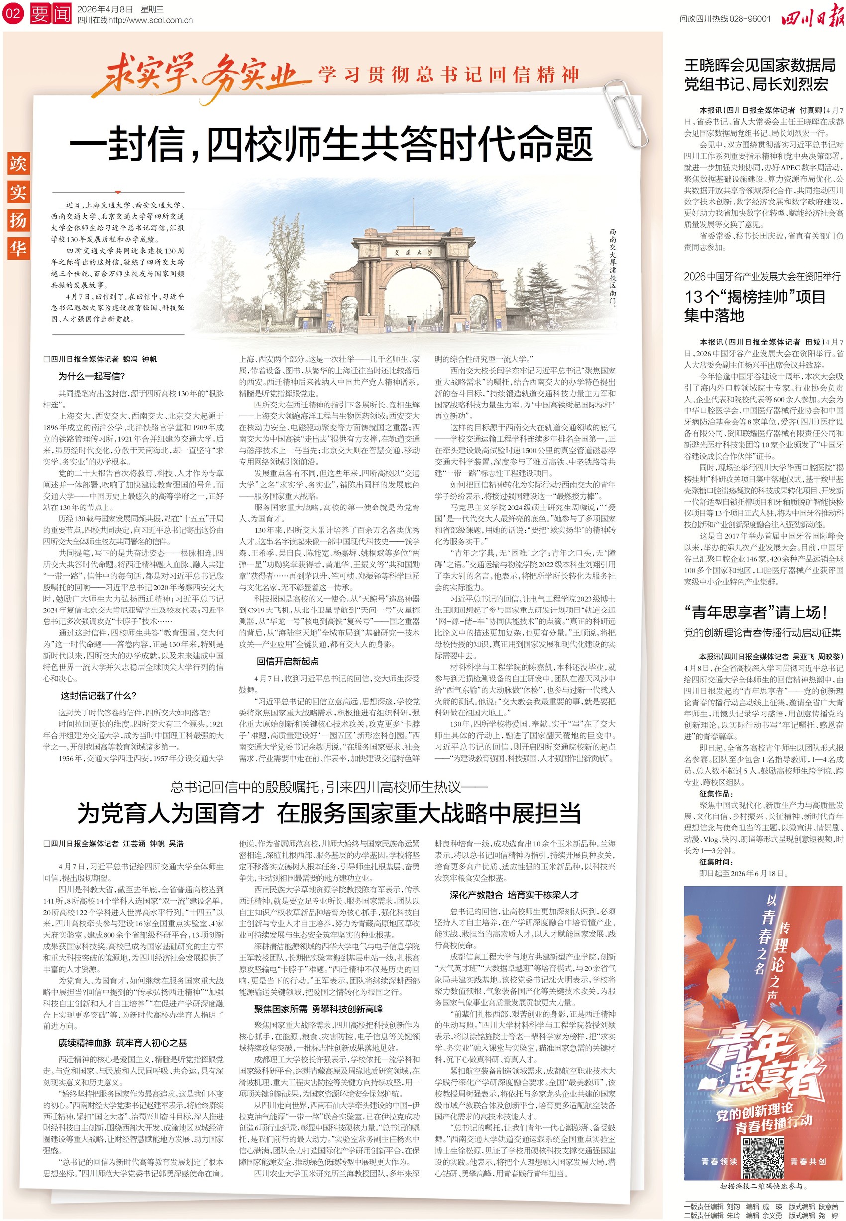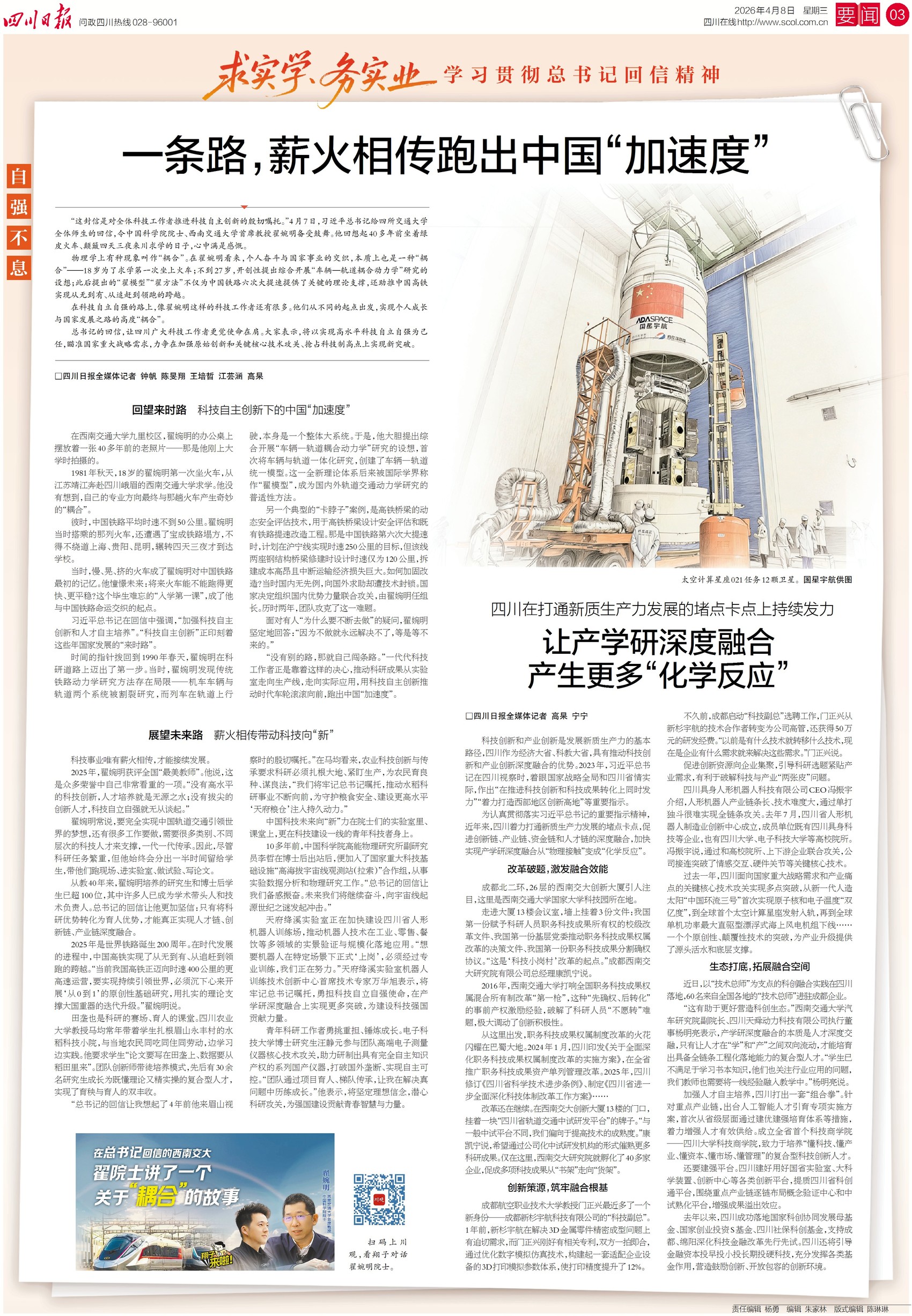 回信如号角,为四川高校科创动能注入更强动力——翟婉明院士助力高铁领跑、职务科技成果改革破冰、产学研深度融合,这些早已深耕的实干,如今更添奋进力量。今日四川日报二、三版推出特别报道,看四校师生共答时代命题。