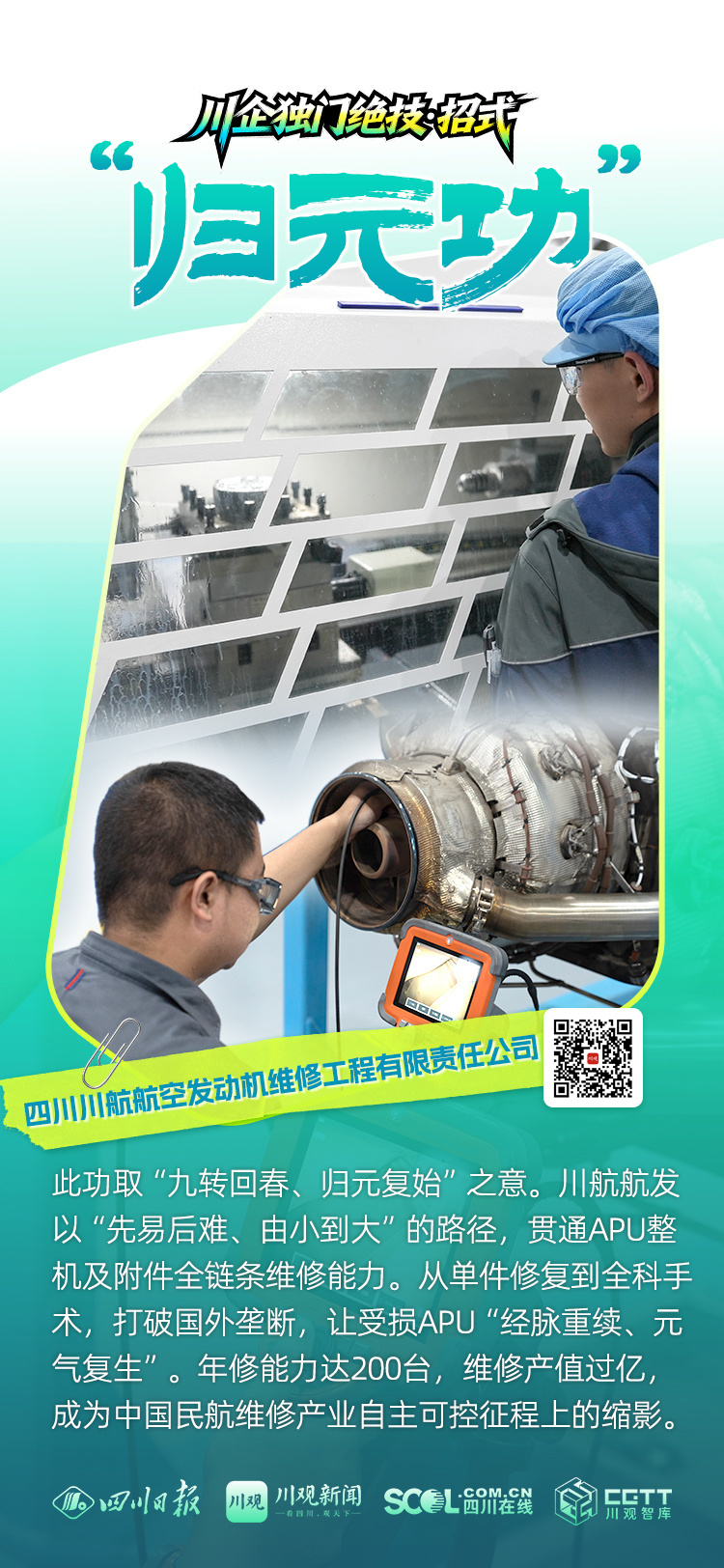 此功取“九转回春、归元复始”之意。川航航发以“先易后难、由小到大”的路径,贯通APU整机及附件全链条维修能力。从单件修复到全科手术,打破国外技术垄断,让受损APU“经脉重续、元气复生”。年修能力达200台,维修产值过亿,成为中国民航维修产业自主可控征程上的缩影。