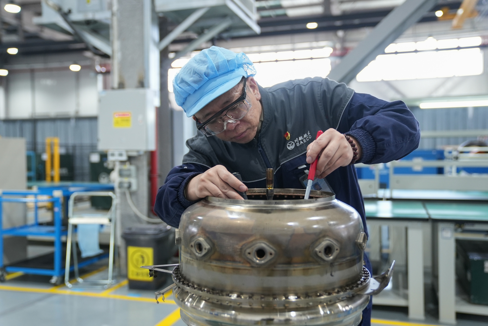 杨志菲正在检查环形燃烧室的零件