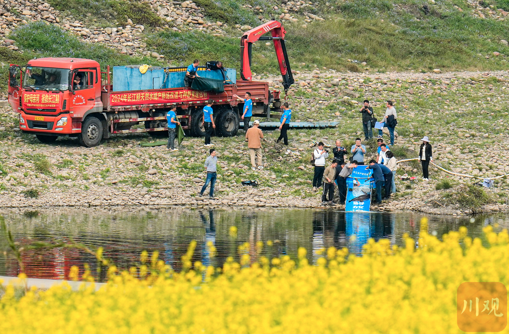 2026年3月,科研人员将长江鲟亲鱼放入长江的天然产卵场中。