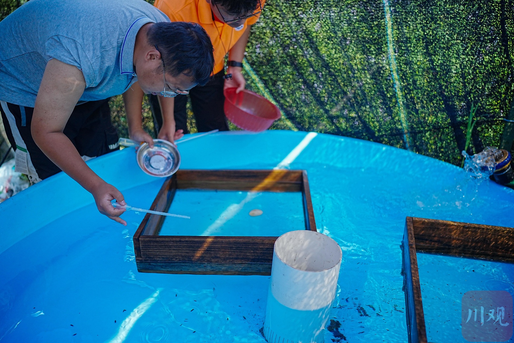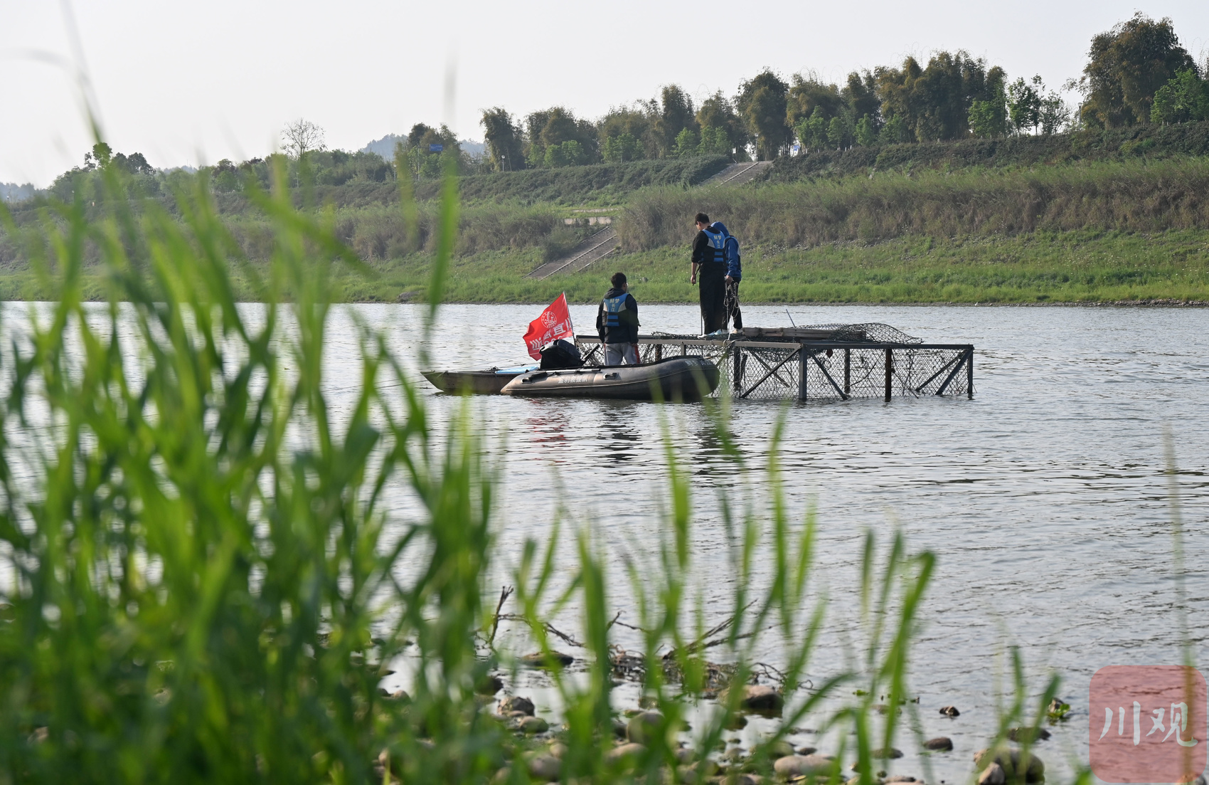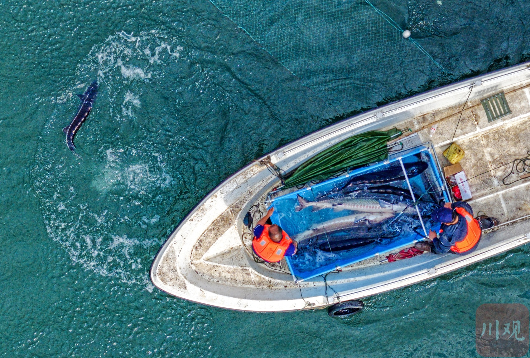 2023年4月,科研人员在江安县长江河道中进行长江鲟试验。
