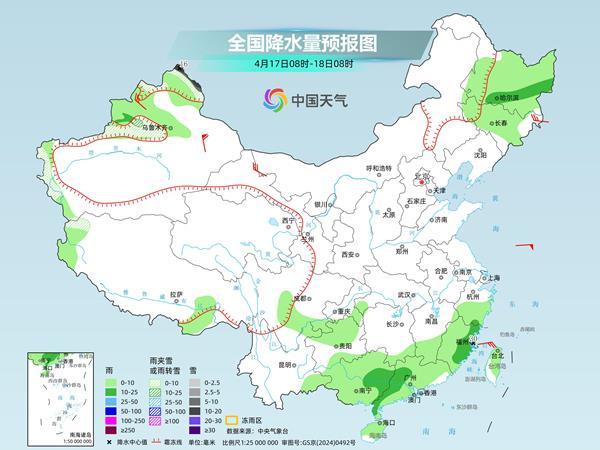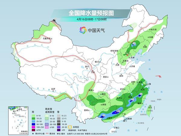 明天,新疆伊犁河谷和南疆西部山区、内蒙古东北部等地部分地区有小雪或雨夹雪,其中,新疆北疆阿勒泰山区部分地区有中到大雪,局地暴雪。江淮南部、江南东部和南部、四川南部、贵州西北部、广西西部和中北部、广东北部以及内蒙古东南部、河北北部等地部分地区有中到大雨,其中,江西中部、浙江西南部、福建西北部、广西西南部和东北部等地部分地区有暴雨,局地大暴雨。