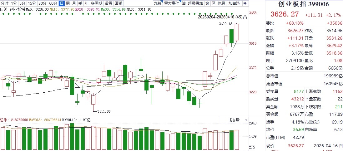作为创业板的重要权重股,“易中天”的强势拉升对指数走高形成明显推动,创业板指全日大涨超过3%,领涨A股。